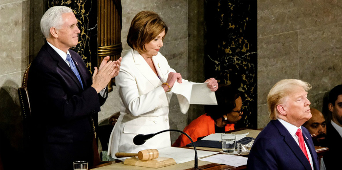 აშშ-ის კონგრესის ქვედა პალატის სპიკერმა, ნენსი პელოსიმ, აშშ-ის პრეზიდენტის, დონალდ ტრამპის, კოგრესისადმი ყოველწლიური მიმართვის ტექსტის ასლი, დემონსტრაციულად დახია.