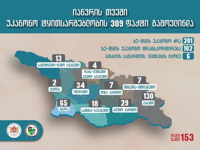 გარემოს დაცვისა და სოფლის მეურნეობის სამინისტროს გარემოსდაცვითი ზედამხედველობის დეპარტამენტის თანამშრომლებმა, 2020 წლის 01 იანვრიდან 31 იანვრის ჩათვლით, ხე-ტყის უკანონო მოპოვებისა და ტრანსპორტირების 309 ფაქტი გამოავლინეს, მათ შორის 6 ფაქტი სისხლის სამართლის დანაშაულის ნიშნებს შეიცავს.