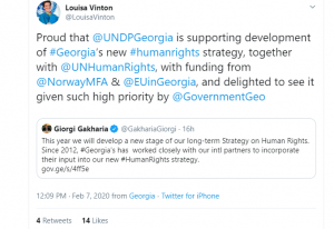 „მეამაყება, რომ გაეროს განვითარების პროგრამა ადამიანის უფლებების ორგანიზაციასთან ერთად მხარს უჭერს საქართველოს ახალ სტრატეგიას ადამიანის უფლებების სფეროში, რისთვისაც დაფინანსება ნორვეგიის საგარეო საქმეთა სამინისტრომ და საქართველოში ევროკავშირის წარმომადგენლობამ გამოჰყვეს. გვახარებს, რომ საკითხს ასეთი მაღალი პრიორიტეტულობა ენიჭება საქართველოს მთავრობის მხრიდან,” – ასე ეხმაურება გაეროს განვითარების პროგრამის (UNDP) მუდმივი წარმომადგენელი საქართველოში ლუიზა ვინტონი სოციალურ ქსელ „ტვიტერის” ოფიციალურ გვერდზე საქართველოს პრემიერ-მინისტრ გიორგი გახარიას „ტვიტს” ადამიანის უფლებების გრძელვადიან სტრატეგიაზე მუშაობის ახალ ეტაპზე გადასვლასთან დაკავშირებით.