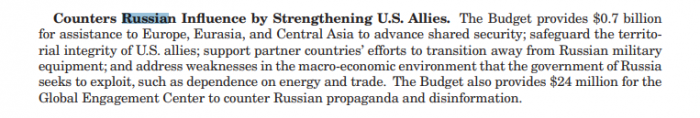 გარდა ამისა, 24 მლნ გამოყოფა იგეგმება გლობალური ურთიერთქმედების ცენტრისთვის, რომ მოხდეს რუსეთის პროპაგანდისა და დეზინფორმაციისთვის წინააღმდეგობის გაწევა.