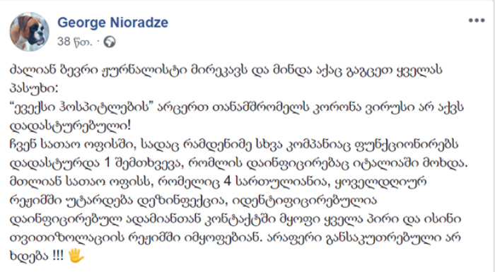 “ევექსის” საზოგადოებასთან ურთიერთობის მენეჯერი გიორგი ნიორაძე სოციალურ ქსელში პოსტს აქვეყნებს, სადაც ადასტურებს, რომ “ევექსი ჰოსპიტლების” არცერთ თანამშრომელს კორონა ვირუსი არ აქვს დადასტურებული.