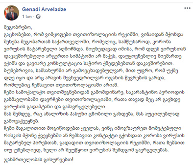 “მეგობრებო, გაცნობებთ, რომ ვიმყოფები თვითიზოლაციის რეჟიმში, ვინაიდან მქონდა შეხება მეგობართან საქართველოში, რომელიც, სამწუხაროდ, კორონავირუსის მატარებელი აღმოჩნდა. მიუხედავად იმისა, რომ დღეს ვირუსთან დაკავშირებული არც ერთი სიმპტომი არ მაქვს, დაუყოვნებლივ მივმართე ექიმს და გავიარე კონსულტაცია საჭირო ქმედებებთან დაკავშირებით. ბუნებრივია, სამსახურში არ გამოვცხადებულვარ, მით უფრო, რომ უქმე დღე იყო და არც არავის შევხვედრილვარ ოჯახის წევრების გარდა, რომლებიც ჩემსავით თვითიზოლაციაში არიან. ჩემი სამოქალაქო თვითშეგნებიდან გამომდინარე, საკარანტინო პერიოდის განმავლობაში დავრჩები თვითიზოლაციაში, რათა თავად მეც არ გავხდე ვირუსის გადამტანი და გამავრცელებელი. მას შემდეგ, რაც ანალიზის პასუხი ცნობილი გახდება, მას აუცილებლად გამოვაქვეყნებ. ჩემი მაგალითით მოგიწოდებთ ყველას, ვინც იმოგზაურეთ მომეტებული რისკის მქონე ქვეყნებში ან ჩემსავით კონტაქტი გქონდათ კორონავირუსის მატარებელ პირებთან, გადადით თვითიზოლაციის რეჟიმში, რათა ნებსით თუ უნებლიედ, ხელი არ შეუწყოთ ვირუსის შემდგომ გავრცელებას. ჯანმრთელობას გისურვებთ!”,- წერს არველაძე “ფეისბუქზე”.