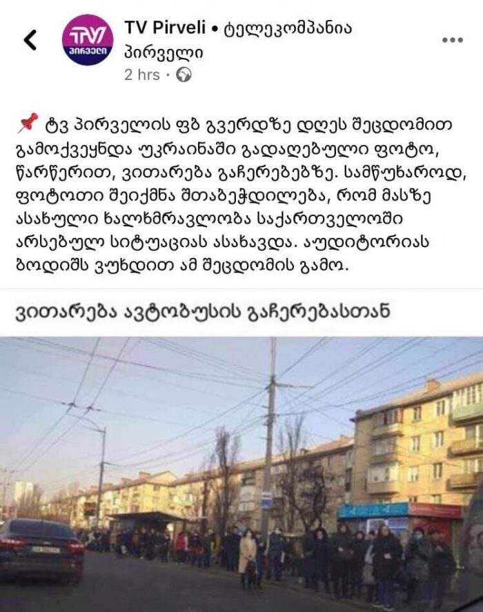 ცნობისთვის, ტვ პირველის ფბ გვერდზე დღეს გამოქვეყნდა უკრაინაში გადაღებული ფოტო, წარწერით, ვითარება გაჩერებებზე. ფოტოთი შეიქმნა შთაბეჭდილება, რომ მასზე ასახული ხალხმრავლობა საქართველოში არსებულ სიტუაციას ასახავდა. მოგვიანებით, ტვ პირველმა თავის ფეიჯზე გაავრცელა ინფორმაცია, რომ ეს ფოტო სინამდვილეს არ შეესაბამებოდა და შეცდომის გამო აუდიტორიას ბოდიში მოუხადა.