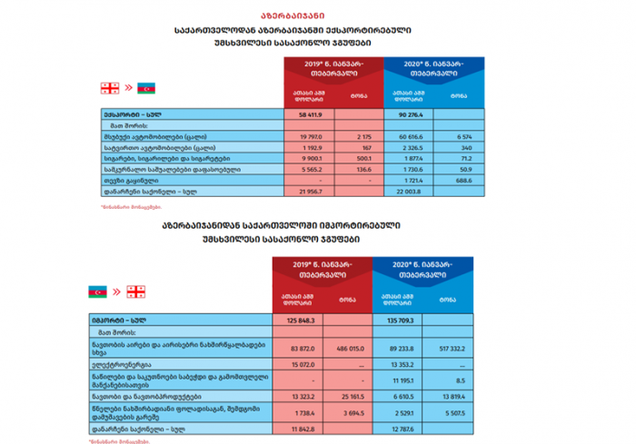 მართალია უმნიშვნელოდ, თუმცა აზერბაიჯანის წილი გაიზარდა იმპორტის ნაწილშიც. ამ მაჩვენებლით ( 135 მლნ. დოლარი) აზერბაიჯანი მხოლოდ თურქეთსა (214.5 მლნ. დოლარი) და რუსეთს ( 136.8 მლნ.დოლარი) ჩამორჩება. საინტერესოა, რომ მიმდინარე წლის ორ თვეში საქართველომ ყველაზე მეტი პროდუქცია ( 90 მლნ.დოლარი) სწორედ აზერბაიჯანში გაყიდა და, შესაბამისად, საქართველოს მთავარი საექსპორტო პარტნიორიც აზერბაიჯანია.