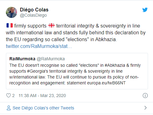 „საფრანგეთი მტკიცედ უჭერს მხარს საქართველოს ტერიტორიულ მთლიანობასა და სუვერენიტეტს, საერთაშორისო სამართლის შესაბამისად და სრულად უჭერს მხარს ევროკავშირის განცხადებას აფხაზეთის „არჩევნებთან“ დაკავშირებით“, – აცხადებს ფრანგი დიპლომატი.