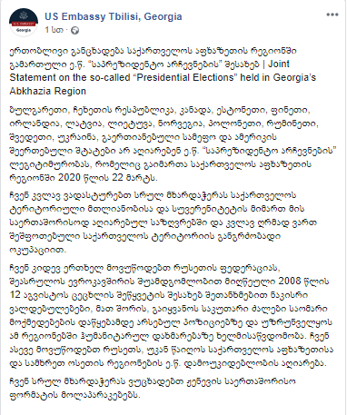 “ბულგარეთი, ჩეხეთის რესპუბლიკა, კანადა, ესტონეთი, ფინეთი, ირლანდია, ლატვია, ლიეტუვა, ნორვეგია, პოლონეთი, რუმინეთი, შვედეთი, უკრაინა, გაერთიანებული სამეფო და ამერიკის შეერთებული შტატები არ აღიარებენ ე.წ. “საპრეზიდენტო არჩევნების” ლეგიტიმურობას, რომელიც გაიმართა საქართველოს აფხაზეთის რეგიონში 2020 წლის 22 მარტს.