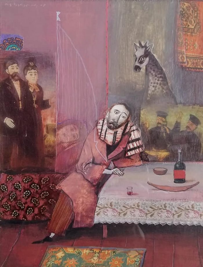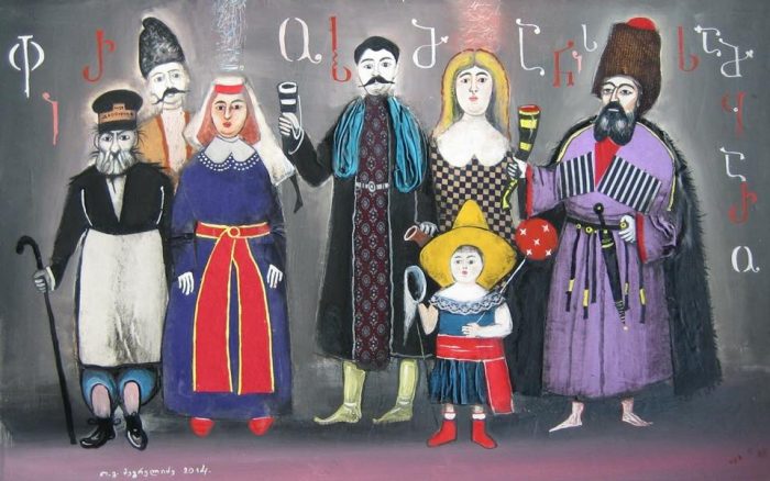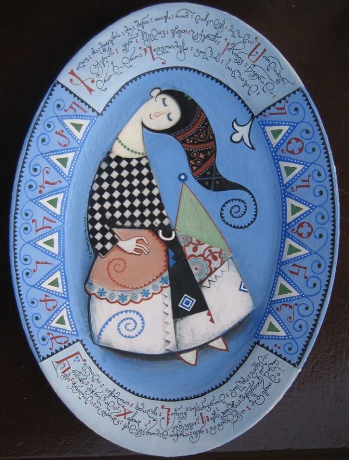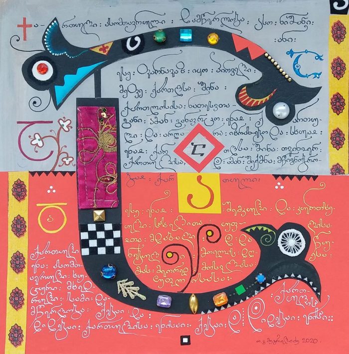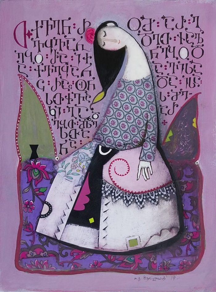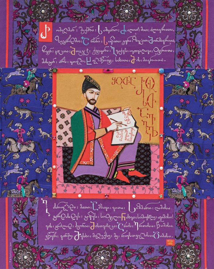 – კალიგრაფიული მხატვრობა… თქვენი ნამუშევრები მოსკოვის თანამედროვე კალიგრაფიის მუზეუმში ინახება. ასევე დიდი ბრიტანეთის ეროვნული ბიბლიოთეკის მოხატულ ხელნაწერთა ფონდში განთავსდა, ფრანკფურტში, ოფენბახის შრიფტების მუზეუმში ქართული ანბანისადმი მიძღვნილ გამოფენაშიც მონაწილეობდით. გამორჩეულია თქვენი „ქართული ანბანი“, „ვეფხისტყაოსნის“ თემატიკა… ზოგადად, თქვენს მხატვრობაში შერწყმულია თქვენი, როგორც კალიგრაფის ოსტატობაც… როგორ უხამებთ ერთმანეთს ამ ყველაფერს – ფიგურებს, ფერებს, ასოებს… ალბათ დიდხანს მუშაობთ ერთ ნამუშევარზე… |