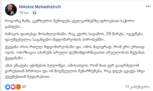 „როგორც ჩანს, ცენზურის შემოღება ტელეარხებზე დროებით საჭირო გახდება. პანიკის დათესვა მოსახლეობაში, რაც კვირა საღამოს, 29 მარტს, იგეგმება, დაუშვებელია საგანგებო მდგომარეობის პირობებში. ქვეყანა არის რთულ მდგომარეობაში და, იმის მაგივრად, რომ ერი ერთად იყოს, ოპოზიცია აპირებს სრული დეზინფორმაციით არეულობის შეტანას ქვეყანაში. ამას ემატება ექიმების ბულინგი, იმისათვის, რომ მათ ვერ გააგრძელონ ვირუსთან ბრძოლა და იმ მიღწეულის შენარჩუნება, რაც დღეს გვაქვს სხვა ქვეყნებთან შედარებით”, – აღნიშნავს ნიკოლოზ მჭედლიშვილი.