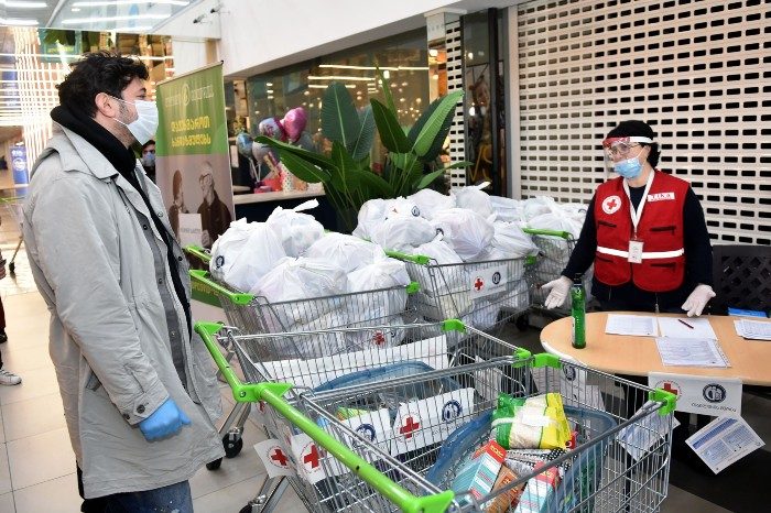 თბილისის მერიის ინფორმაციით, ჰიპერმარკეტ „გუდვილში“ მისულ მომხმარებელს დახვდება „წითელი ჯვრის“ კუთხე, სადაც მათ მოხალისეები საჭირო პროდუქტებთან დაკავშირებით რეკომენდაციას გაუწევენ. „წითელი ჯვრის“ კუთხე ასევე, ფუნქციონირებს ჰიპერმარკეტ „აგროჰაბის“ ყველა ფილიალში. სოციალურად დაუცველი მარტოხელა ხანდაზმულებისთვის საკვები პროდუქტითა და პირველადი საჭიროების ნივთებით უზრუნველყოფის კამპანია გაგრძელდება და სისტემატურ ხასიათს მიიღებს. ბიზნესკომპანიებს, რომელთაც ქველმოქმედების სურვილი აქვთ, პროდუქტების მიტანა თბილისში, ბელიაშვილის N5-ში მდებარე სპეციალურ ფართში შეუძლიათ. საქართველოს წითელი ჯვრის საზოგადოებასა და ნუტრიციოლოგებთან ერთად, შედგენილია მინიმალური პაკეტი, რომელიც დაახლოებით, ათი დღის მარაგია და ორ მიმართულებას მოიცავს: საკვები პროდუქტები და მედიკამენტები, ასევე, ჰიგიენური საშუალებები. ესენია: შაქარი, ბრინჯი, ჩაი, მაკარონი, წიწიბურა, შვრიის ფანტელი, ხორბლის ფქვილი, ზეთი, მარილი, ლობიო, ორცხობილა და პირველადი მოხმარების საგნები. აღნიშნული პაკეტი მარტოხელა მოხუცებს დატრენინგებული მოხალისეების და რაიონული გამგეობების თანამშრომლების საშუალებით გადაეცემათ, მოხალისეობის მსურველები კი მერიის ცხელ ხაზზე: 2 72 22 22 უნდა დარეგისტრირდნენ. ღონისძიება უწყებათაშორისი საკოორდინაციო საბჭოს რეკომენდაციით ხორციელდება.