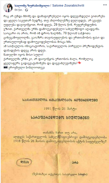 “რაც უნდა მძიმე და დამაფიქრებელი იყოს დღევანდელი ვითარება და ყველა საკუთარ ბედზე თუ ახლობლებზე ღელავდეს, არ გვაქვს უფლება დავივიწყოთ, რომ დღეს, 29 წლის წინ, რეფერენდუმის გზით, ქართველმა ერმა დამოუკიდებელი სახელმწიფო აღადგინა.