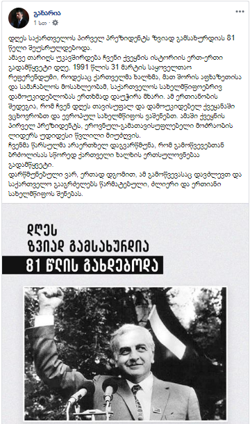 “დღეს საქართველოს პირველ პრეზიდენტს ზვიად გამსახურდიას 81 წელი შეუსრულდებოდა.