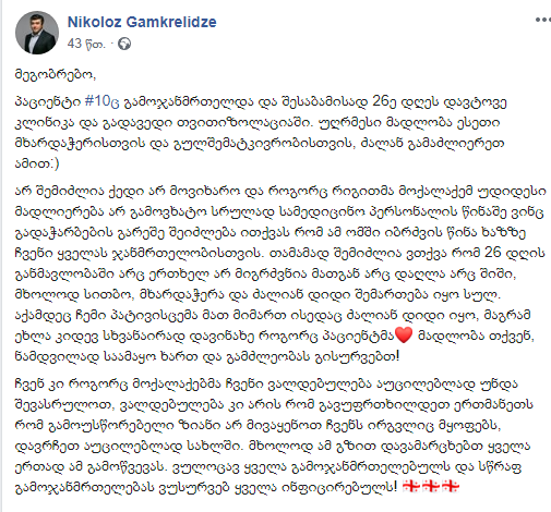 პაციენტი #10-ც გამოჯანმრთელდა და, შესაბამისად, 26-ე დღეს დავტოვე კლინიკა და გადავედი თვითიზოლაციაში. უღრმესი მადლობა ასეთი მხარდაჭერისა და გულშემატკივრობისთვის, ძალიან გამაძლიერეთ ამით.