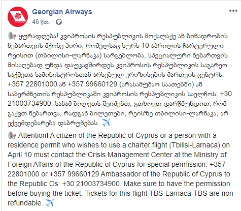 “კვიპროსის რესპუბლიკის მოქალაქე ან ბინადრობის ნებართვის მქონე პირი, რომელსაც სურს 10 აპრილის ჩარტერული რეისით (თბილისი-ლარნაკა) სარგებლობა, სპეციალური ნებართვის მისაღებად უნდა დაუკავშირდეს კვიპროსის რესპუბლიკის საგარეო საქმეთა სამინისტროსთან არსებულ კრიზისების მართვის ცენტრს: +357 22801000 ან +357 99660129 (არასამუშაო საათებში) ან საბერძნეთის რესპუბლიკაში კვიპროსის რესპუბლიკის საელჩოს: +30 21003734900. სანამ ბილეთს შეიძენთ, გთხოვთ დარწმუნდით, რომ გაქვთ ნებართვა, რადგან ბილეთები, რეისზე თბილისი-ლარნაკა, არ ექვემდებარება დაბრუნებას”, – ნათქვამია განცხადებაში.