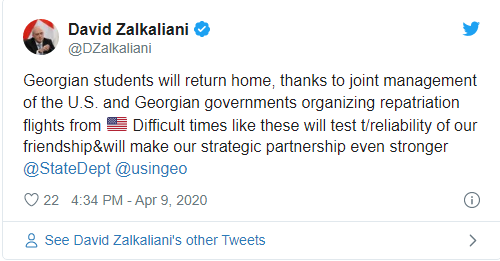 საქართველოს საგარეო საქმეთა მინისტრი, დავით ზალკალიანი აშშ-ში მყოფი ქართველი მოსწავლეების საქართველოში დასაბრუნებლად სპეციალური რეისის დანიშვნის ფაქტს “ტვიტერის” გვერდზე გამოეხმაურა.