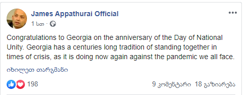როგორც მან Facebook-ის პირად გვერდზე დაწერა, საქართველოს კრიზისის პერიოდში ერთად დგომის მრავალსაუკუნოვანი ტრადიცია აქვს და ასე ხდება ახლაც პანდემიასთან ბრძოლის დროს.
