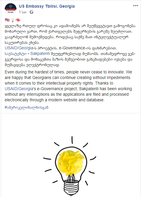 აშშ-ის საელჩო საქართველოში: მოხარულნი ვართ, რომ ქართველებს შეფერხების გარეშე შეუძლიათ, გააგრძელონ შემოქმედება, როდესაც საქმე მათ ინტელექტუალურ საკუთრებას ეხება