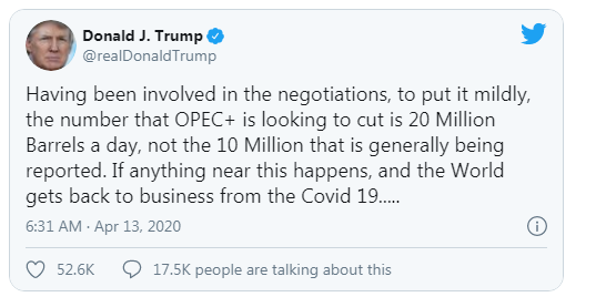 „ჩართული ვიყავი მოლაპარაკების პროცესში, რბილად რომ ვთქვათ, „ოპეკ პლუსი“ დღეში არა უკვე ნათქვამი 10 მილიონი ბარელის შემცირებას აპირებს, არამედ 20-ის. თუ რამე მსგავსი მოხდა და მსოფლიო „კოვიდ-19“-ის შემდეგ ბიზნესს დაუბრუნდა, ენერგეტიკის ინდუსტრია კვლავ ძლიერი იქნება, გაცილებით სწრაფად, ვიდრე ახლა მოიაზრება. გმადლობ ყველას, ვინც ჩემთან ერთად მუშაობდა ამ ბიზნესის ფეხზე დაყენებისთვის, კერძოდ რუსეთსა და საუდის არაბეთს“, – წერს აშშ-ის პრეზიდენტი სოციალურ ქსელ „ტვიტერში“.