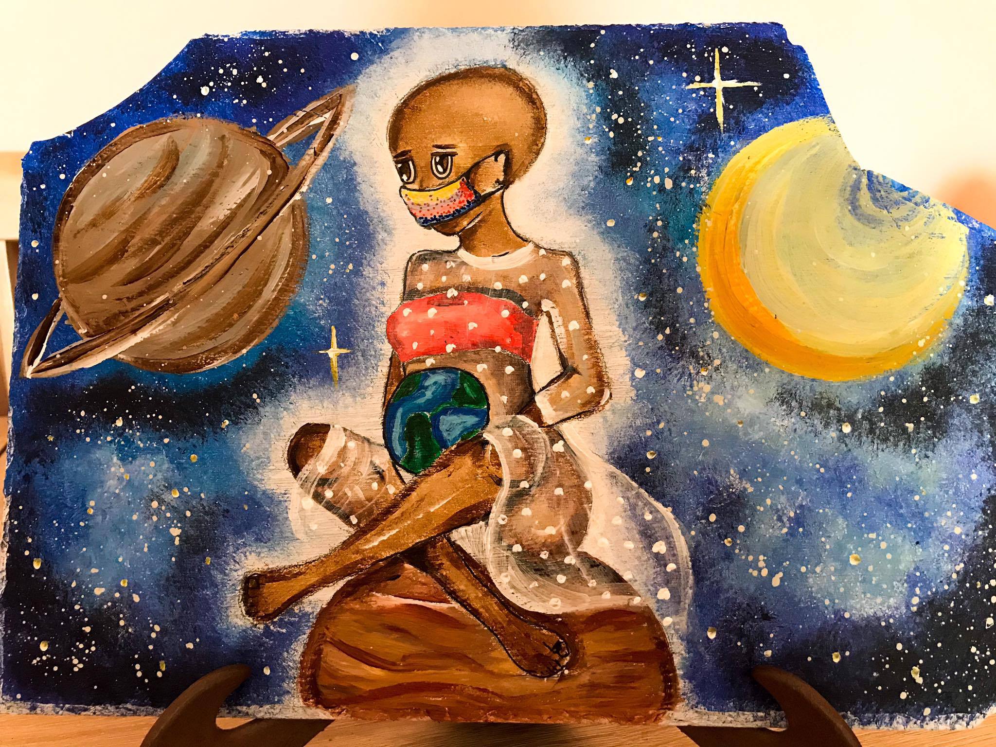 – ისედაც მშვიდია, მაგრამ ძალიან არ ეშინია, ცდილობს, მაღლა, კოსმოსში გაერკვეს ამ სამყაროში არსებულ ვითარებაში. ნახატს ჰქვია: „ჟოზეფინა და Codiv-19“.