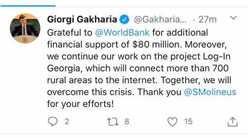 „მადლობას ვუხდი მსოფლიო ბანკს 80 მილიონი აშშ დოლარის ოდენობის დამატებითი ფინანსური მხარდაჭერისთვის. მეტიც, ჩვენ ვაგრძელებთ თანამშრომლობას პროექტის – Log In Georgia ფარგლებში, რათა სოფლად 700-ზე მეტი ადგილი დავუკავშიროთ ინტერნეტს. ერთად დავძლევთ კრიზისს! მადლობა სებასტიან მოლინეუსს მისი ძალისხმევისთვის!”, – წერს გიორგი გახარია „ტვიტერში”.