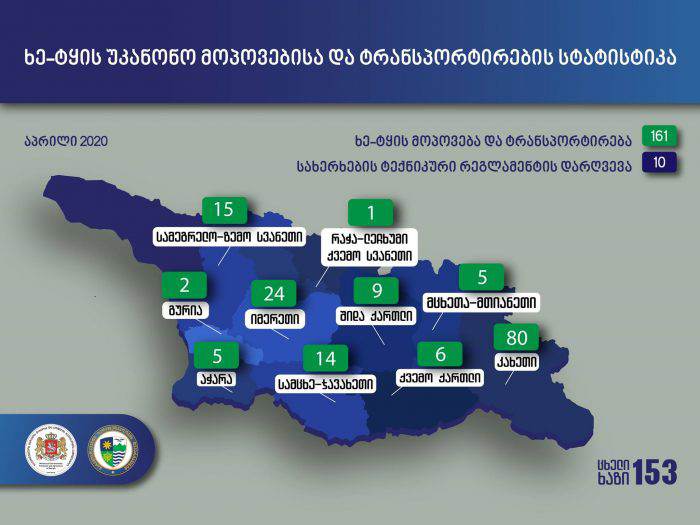 გარემოს დაცვისა და სოფლის მეურნეობის სამინისტროს გარემოსდაცვითი ზედამხედველობის დეპარტამენტის თანამშრომლებმა, 1-ელი აპრილიდან 30 აპრილის ჩათვლით ხე-ტყის უკანონო მოპოვებისა და ტრანსპორტირების 161 ფაქტი გამოავლინეს, მათ შორის 3 ფაქტი სისხლის სამართლის დანაშაულის ნიშნებს შეიცავს.