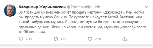 “საფრანგეთში ბიზნესმენს “ჯოკონდას” გაყიდვა უნდა. ჩვენ ლენინის მუმიის გაყიდვა შეგვიძლია. მყიდველები მოიძებნება: ჩინეთი, ვიეტნამი ან სხვა რომელიმე კომუნისტი. მუმიის გაყიდვიდან მიუჯეტი დიდ ფულს მიიღებდა. ლენინი კარგ მდგომარეობაშია, სულ რაღაც, 96 წლის წინ გახადეს მუმიად”, – წერს ჟირინოვსკი.