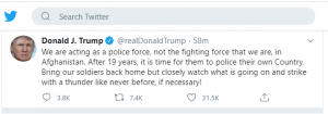 „ავღანეთში ჩვენ ვიქცევით საპოლიციო და არა საბრძოლო ძალებივით, რაც სინამდვილეში ვართ. 19 წლის შემდეგ დადგა დრო, ამერიკელმა სამხედროებმა საპოლიციო კონტროლი თავის ქვეყანას გაუწიონ. დააბრუნეთ ჩვენი ჯარისკაცები სახლში, მაგრამ ყურადღებით ადევნეთ თვალი მოვლენებს და, საჭიროების შემთხვევაში, ელვისებური დარტყმა მიაყენეთ“, – დაწერა აშშ-ის პრეზიდენტმა.