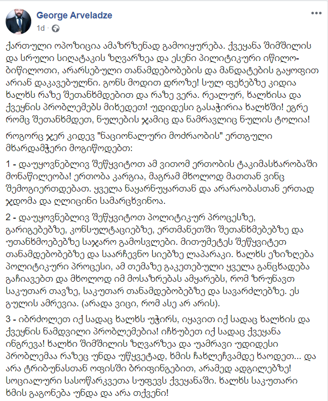 პარტია “ნაციონალური მოძრაობის” ყოფილი დეპუტატი, გიორგი არველაძე სოციალურ ქსელში ვრცელ პოსტს აქვეყნებს, სადაც ოპოზიციას რევოლუციისკენ მოუწოდებს.