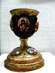 ექსპონატი ვერცხლის,ოქროს წყალში ამოვლებულია. აქვს რუსული წარწერა, ხოლო სასმისსა და სადგამზე ჩასმული აქვს წმინდანების ფერწერული მინანქრიანი პორტრეტები. (20X12X6 . წონა – 840გრ.)