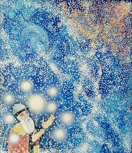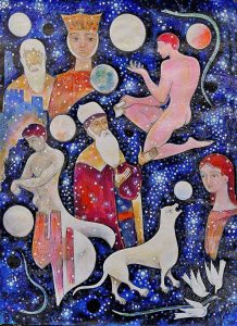 „რუსთაველი კოსმიურ მთლიანობაში, ერთარსებობა“ – ასე ასათაურებს მხატვარი ნამუშევარს, და იქვე რუსთველის სტრიქონებს მოიხმობს: