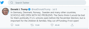 “გერმანიაში, დანიაში, ნორვეგიაში, შვედეთსა და ბევრ სხვა ქვეყანაში სკოლები გახსნეს უპრობლემოდ. დემოკრატებს მიაჩნიათ, რომ მათთვის პოლიტიკურად ცუდი იქნება, თუ ნოემბრის არჩევნებამდე სკოლები არ გაიხსნება, მაგრამ ეს ბავშვებისა და ოჯახებისთვის არის მნიშვნელოვანი. დაფინანსება შეიძლება, შემცირდეს, თუ ისინი არ გაიხსნება!”, – დაწერა ტრამპმა.