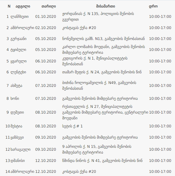 1-30 ოქტომბერს ფინანსთა სამინისტროს შემოსავლების სამსახურის მოძრავი სერვისცენტრი – RS CAR – გადასახადის გადამხდელებს 32 ლოკაციაზე, იმ რეგიონებში მოემსახურება, სადაც შემოსავლების სამსახურის სერვისცენტრები არ არის განთავსებული. შემოსავლების სამსახურის ცნობით, RS CAR (მიკროავტობუსი) შემოსავლების სამსახურის სერვისცენტრებში არსებული ტექნიკური საშუალებებითაა აღჭურვილი. შესაბამისად, გადასახადების გადამხდელებს შესაძლებლობა აქვთ, მათთვის ხელსაყრელ დროსა და სივრცეში, დასახლებული პუნქტიდან გაუსვლელად, დროულად მიიღონ სასურველი მომსახურება.