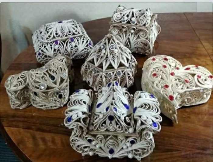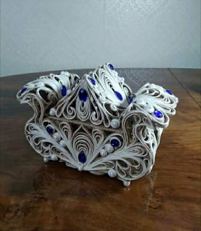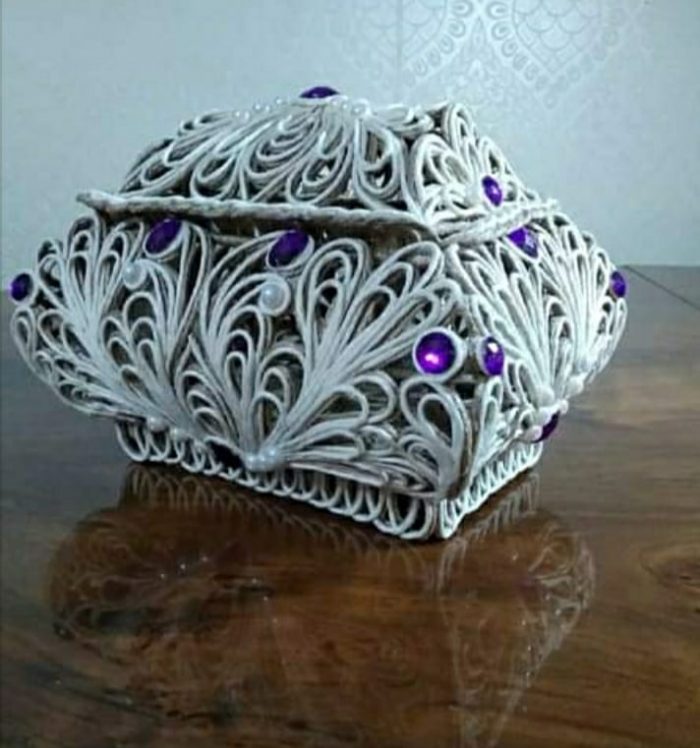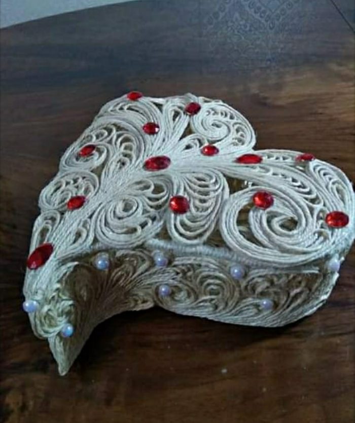 დაახლოებით 4 წლის წინ კი ინტერნეტში შემთხვევით გადააწყდა ჯვალოს ნაჭრისგან და ძაფისგან დამზადებულ ყვავილებს, ტოპიარებს და თავადაც სცადა… შემდეგ ამას ვენეციური ნიღბების იმიტაციაც დაემატა. ახლა კი ზარდახშებზე მუშაობს. ჯვალო და ჯუთი მისი სამუშაო მასალებია.