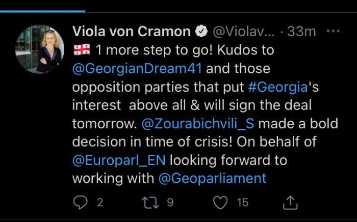 „კიდევ ერთი ნაბიჯი დარჩა, მივესალმები და შევაქებ „ქართულ ოცნებას“ და ყველა იმ ოპოზიციურ პარტიას, ვინც საქართველოს ინტერესი ყველაფერზე მაღლა დააყენა და ხვალ მოაწერს ხელს შეთანხმებას. სალომე ზურაბიშვილმა მნიშვნელოვანი გადაწყვეტილება მიიღო კრიზისის დროს. ევროპარლამენტის სახელით ველოდები მუშაობას საქართველოს პარლამენტთან“, – განაცხადა ვიოლა ფონ კრამონმა.