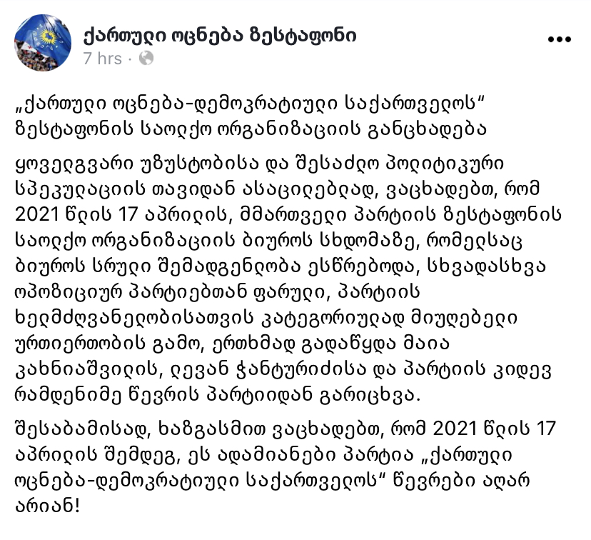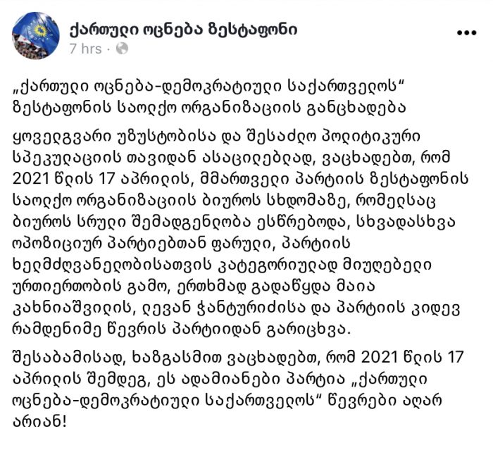 “ყოველგვარი უზუსტობისა და შესაძლო პოლიტიკური სპეკულაციის თავიდან ასაცილებლად, ვაცხადებთ, რომ 2021 წლის 17 აპრილის, მმართველი პარტიის ზესტაფონის საოლქო ორგანიზაციის ბიუროს სხდომაზე, რომელსაც ბიუროს სრული შემადგენლობა ესწრებოდა, სხვადასხვა ოპოზიციურ პარტიებთან ფარული, პარტიის ხელმძღვანელობისათვის კატეგორიულად მიუღებელი ურთიერთობის გამო, ერთხმად გადაწყდა მაია კახნიაშვილის, ლევან ჭანტურიძისა და პარტიის კიდევ რამდენიმე წევრის პარტიიდან გარიცხვა.