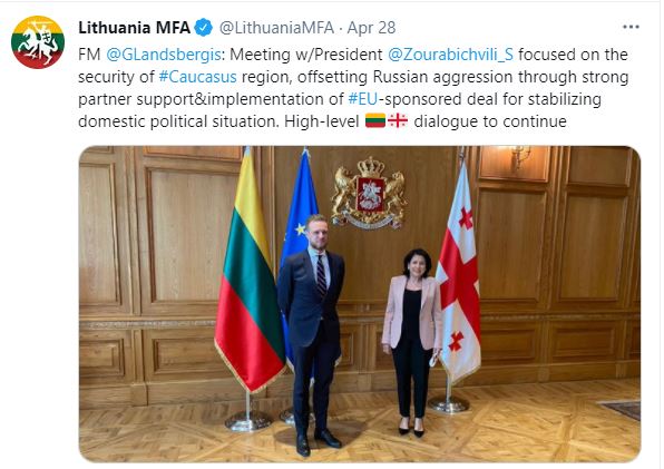 ლიეტუვის საგარეო საქმეთა მინისტრი – გაბრიელიუს ლანდსბერგისი საქართველოს პრეზიდენტ სალომე ზურაბიშვილთან შეხვედრის შესახებ ლიეტუვის საგარეო უწყების „ტვიტერის“ გვერდზე წერს.