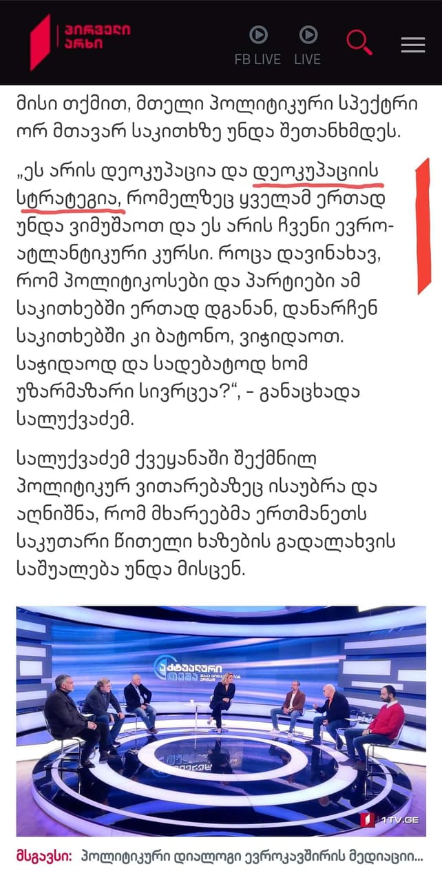 წაიკითხეთ ფოტო ასლი. ეს გადაცემა 12 მარტსაა ჩაწერილი. მანამდეც ბევრჯერ მითქვამს. ყველა პარტიას მოვუწოდებ, მიუხედავად მათი განსხვავებული ხედვებისა, ამ თემასთან დაკავშირებით, ვისაც ეს დეოკუპაციის საკითხი აღელვებს, აქტიურად ჩაერთონ მუშაობაში მმართველ პარტიასთან ერთად, რადგან ეს ზეპარტიული ინტერესია. 10-წლიანი გეგმა, დეოკუპაციის სტრატეგია, ჯერ ეს ორი თემაა, რაც პრემიერმა გააჟღერა. იმედია სხვა სტრატეგიული დოკუმენტებიც, მათ შორის უსაფრთხოების კონცეფცია, დაიძვრება”, – აღნიშნავს სალუქვაძე.