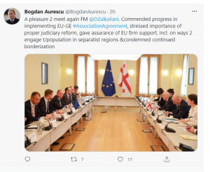 „მივესალმეთ საქართველოს პროგრესს ევროკავშირთან გაფორმებული ასოცირების ხელშეკრულების განხორციელების პროცესში, ხაზგასმით აღვნიშნეთ სასამართლო სისტემაში გატარებული სათანადო რეფორმები, საქართველოს აღვუთქვით ევროკავშირის მტკიცე მხარდაჭერა, მათ შორის, სეპარატისტულ რეგიონებში მცხოვრები მოსახლეობის ჩართულობის მიმართულებით, და დავგმეთ მიმდინარე ბორდერიზაციის პროცესი” – ეს ჩანაწერი ტვიტერის გვერდზე რუმინეთის საგარეო საქმეთა მინისტრმა თავის ქართველო კოლეგასთან, დავით ზალკალიანთან შეხვედრის შემდეგ დატოვა.