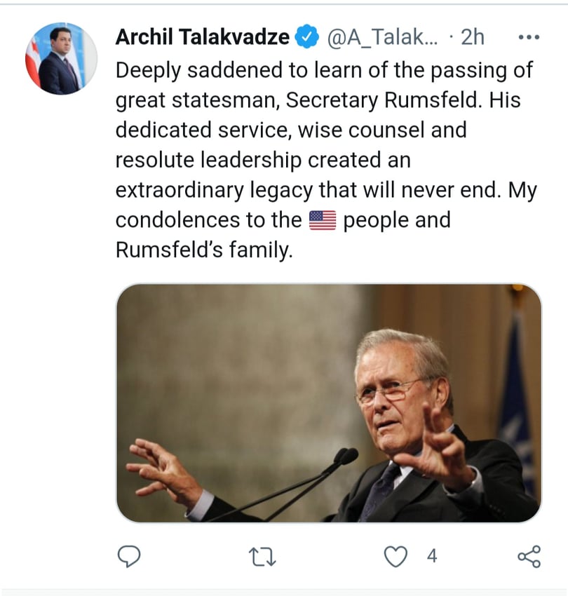 „ღრმად ვარ დამწუხრებული დიდი სახელმწიფო მოღვაწის, დონალდ რამსფელდის გარდაცვალების გამო. მისმა თავდადებულმა საქმიანობამ, გონივრულმა რჩევებმა და მტკიცე ლიდერობამ შექმნა არაჩვეულებრივი მემკვიდრეობა, რომელიც მუდამ გაგრძელდება. ვუსამძიმრებ ამერიკელ ხალხსა და დონალდ რამსფელდის ოჯახს“, – წერს თალაკვაძე Twitter-ზე.