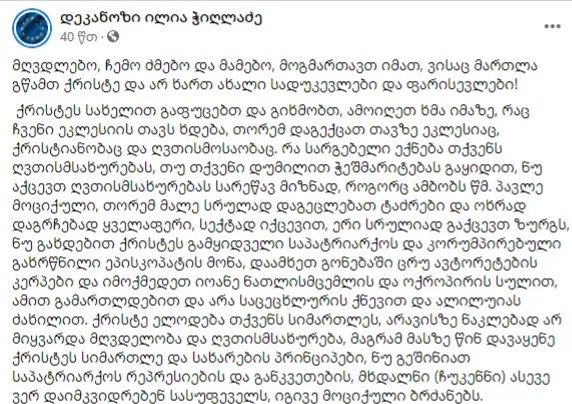 “მღვდლებო, ჩემო ძმებო და მამებო, მოგმართავთ იმათ, ვისაც მართლა გწამთ ქრისტე და არ ხართ ახალი სადუკევლები და ფარისევლები!