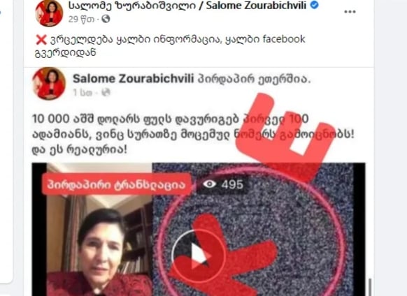 პრეზიდენტი, სალომე ზურაბიშვილი საკუთარი “ფეისბუქის” გვერდზე ინფორმცის ავრცელებს, რომ მისი სახელით, ვრცელდება ყალბი ინფორმაცია, ყალბი “facebook” გვერდიდან.