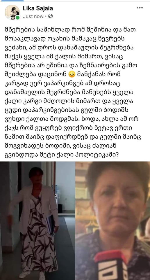 ხოდა, ახლა ამ ორ ქაჯს, რომ ვუყურებ ვფიქრობ ნეტავ ერთი წამით მაინც დაფიქრდნენ და გულში მაინც მოგვიხადეს ბოდიში, ვისაც ძალიან გვინდოდა მეტი ქალი პოლიტიკაში?”, – წერს ლიკა საჯაია.