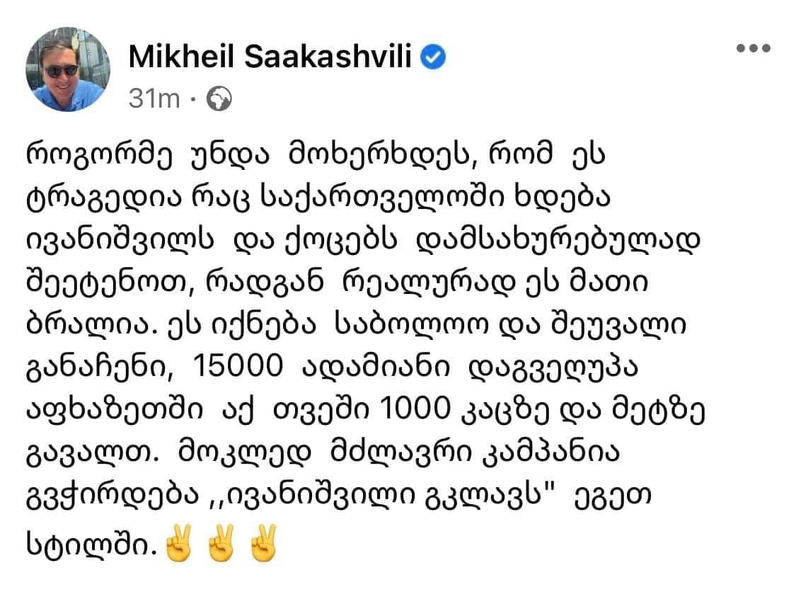 ყოფილმა პრეზიდენტმა მიხეილ სააკაშვილმა დღეს „ფეისბუქში“ დაწერა, რომ როგორმე უნდა მოხერხდეს და „ეს ტრაგედია ივანიშვილს და ქოცებს შეეტენოთ“. „როგორმე უნდა მოხერხდეს, რომ ეს ტრაგედია, რაც საქართველოში ხდება, ივანიშვილს და ქოცებს დამსახურებულად შეეტენოთ, რადგან რეალურად ეს მათი ბრალია. ეს იქნება საბოლოო და შეუვალი განაჩენი, 15 000 ადამიანი დაგვეღუპა აფხაზეთში, აქ თვეში 1000 კაცზე და მეტზე გავალთ. მოკლედ, მძლავრი კამპანია გვჭირდება ,,ივანიშვილი გკლავს“ ეგეთ სტილში“, – წერს სააკაშვილი.