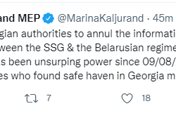 “მოვუწოდებ საქართველოს ხელისუფლებას, გააუქმოს სახელმწიფო უსაფრთხოების სამსახურის ბელარუსულ კა-გე-ბესთან ინფორმაციის გაცვლის შესახებ შეთანხმება”, – ამის შესახებ ევროპარლამენტარი, მარინა კალიურანდი ”ტვიტერზე“ წერს.
