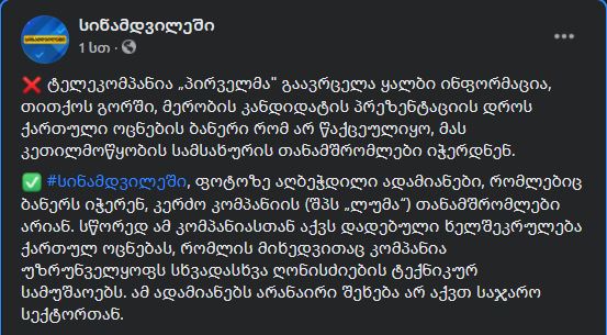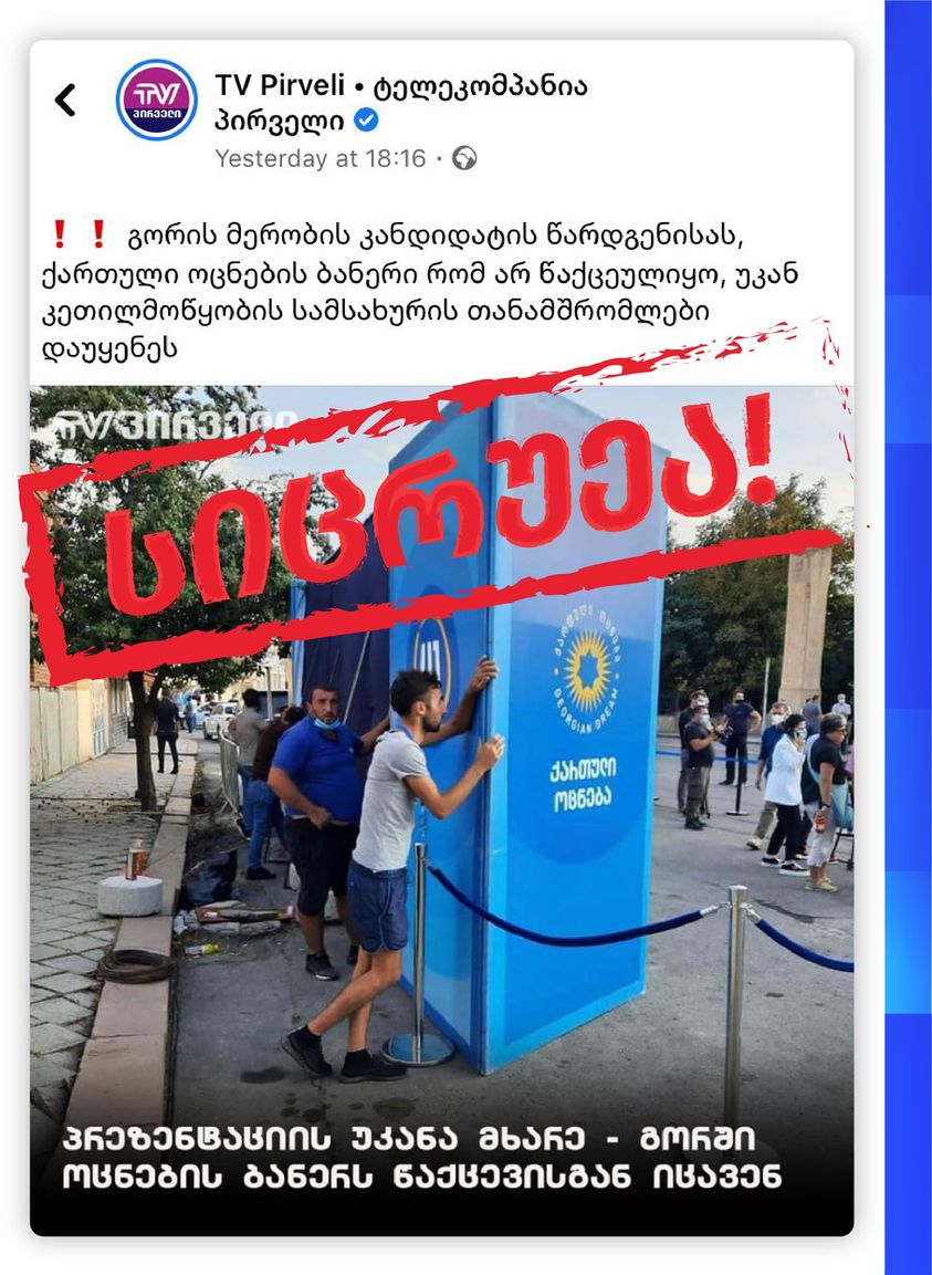 ტელეკომპანია „პირველმა” გაავრცელა ყალბი ინფორმაცია, თითქოს,” გორში, მერობის კანდიდატის პრეზენტაციის დროს „ქართული ოცნების“ ბანერი რომ არ წაქცეულიყო, მას კეთილმოწყობის სამსახურის თანამშრომლები იჭერდნენ”, – ამის შესახებ „ქართული ოცნების“ კომუნიკაციების დეპარტამენტის ფეისბუქ გვერდი, სახელწოდებით „სინამდვილეში“ წერს.