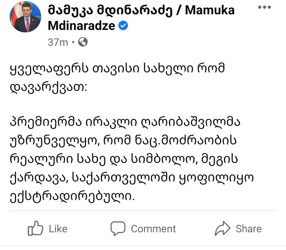 „ყველაფერს თავისი სახელი რომ დავარქვათ: პრემიერმა ირაკლი ღარიბაშვილმა უზრუნველყო, „ნაცმოძრაობის“ რეალური სახე და სიმბოლო, მეგის ქარდავა საქართველოში ყოფილიყო ექსტრადირებული“, – წერს მამუკა მდინარაძე.