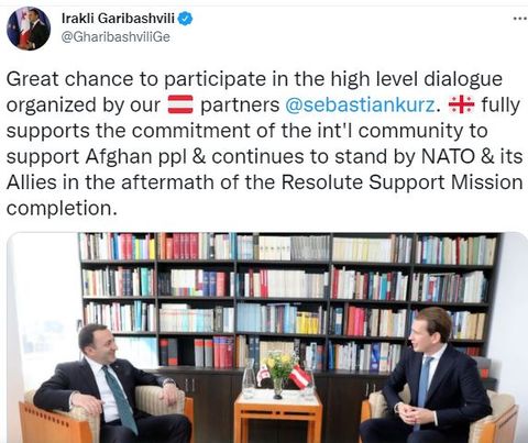 “შესანიშნავი შესაძლებლობა მქონდა, მონაწილეობა მიმეღო ჩვენი ავსტრიელი პარტნიორებისა და თავად ავსტრიის რესპუბლიკის კანცლერის, სებასტიან კურცის მიერ ორგანიზებულ, მაღალი დონის დიალოგში. საქართველო სრულად უჭერს მხარს ავღანელი ხალხის დასახმარებლად საერთაშორისო თანამეგობრობის ინიციატივას და ჩრდილოატლანტიკური ალიანსისა და მისი მოკავშირეების გვერდით დგომას „მტკიცე მხარდაჭერის მისიის” დასრულების შემდეგაც აგრძელებს”, – წერს ირაკლი ღარიბაშვილი.