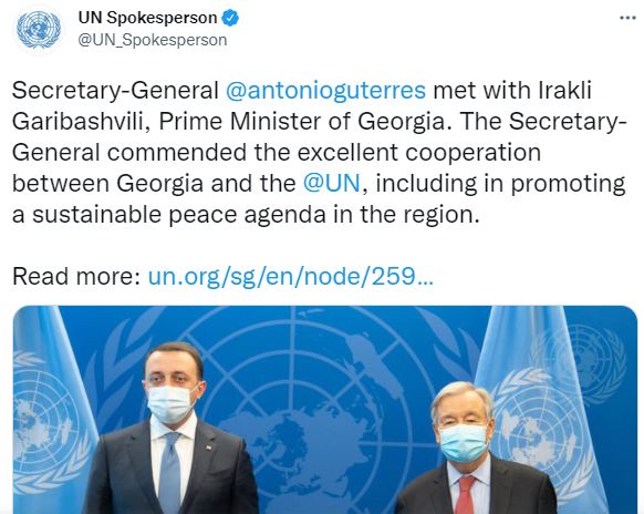 „გაერო-ს გენერალურმა მდივანმა შეაქო საქართველოს მთავრობასა და გაერთიანებული ერების ორგანიზაციას შორის შესანიშნავი თანამშრომლობა, მათ შორის, რეგიონში მდგრადი მშვიდობის დღის წესრიგის ხელშეწყობის მხრივ. გენერალურმა მდივანმა ხაზი გაუსვა გაერო-ს ძლიერ ვალდებულებას ჟენევის საერთაშორისო დისკუსიების მნიშვნელოვანი მუშაობისადმი“, – ნათქვამია განცხადებაში.