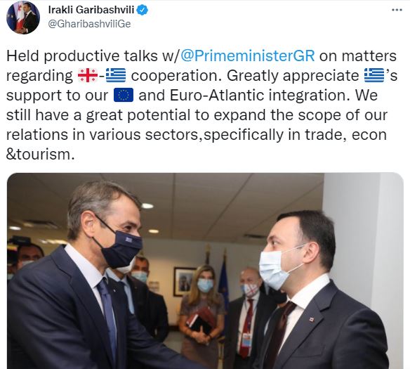 “საბერძნეთის პრემიერმინისტრთან საქართველო-საბერძნეთის თანამშრომლობის შესახებ ნაყოფიერი საუბარი მქონდა. ვაფასებ საბერძნეთის მხრიდან ჩვენი ევროპული და ევროატლანტიკური ინტეგრაციის მხარდაჭერას. ჩვენ კიდევ გვაქვს უზარმაზარი პოტენციალი სხვადასხვა სექტორში ურთიერთობების გასაფართოებლად, განსაკუთრებით – ვაჭრობის, ეკონომიკისა და ტურიზმის მიმართულებით”, – წერს ირაკლი ღარიბაშვილი.