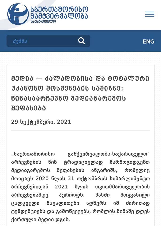 “გავეცანი TI-ის (გამჭვირვალობის) შეფასების დოკუმენტს სათაურით: „…წინასაარჩევნო მედიაგარემოს შეფასება“