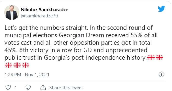 „ადგილობრივი თვითმმართველობის არჩევნების მეორე ტურში „ქართულმა ოცნებამ“ ხმების 55% მიიღო, ხოლო დანარჩენმა ოპოზიციურმა პარტიებმა 45%. „ქართული ოცნების“ ზედიზედ მე-8 გამარჯვება და საზოგადოების უპრეცედენტო ნდობა დამოუკიდებელი საქართველოს ისტორიაში“, – წერს ნიკოლოზ სამხარაძე.